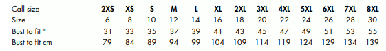 | XS | S | M | L | XL | 2XL | 3XL | |