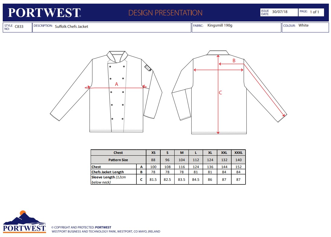 Portwest C833 Suffolk Chefs Jacket L/S C833