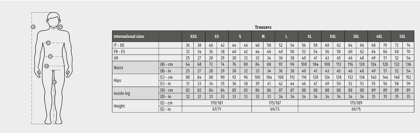 Summer unisex trousers, “4-way stretch” fabric, with side elastics and belt loops, closure with zip and customised button. On the front, they have two rounded pockets, a coin pocket on the right, a safety pocket closed with a zip on the left. On the front of the left leg, there are 3 pockets: a horizontal pocket closed by a zip, a pocket with shaped flap closed with Velcro and equipped with a badge holder and a small vertical pocket closed by a zip. On the front of the right leg, there is a retroreflective stripe. Both trouser legs are equipped with a top-opening knee pad. On the back there are: a pocket with flap closed with Velcro and a pocket without flap but with 2 retroreflective stripes, a hammer ring (right leg), an open tape measure pocket (right leg) and a phone pocket with flap and Velcro (right leg), retroreflective inserts at knee height (both legs), contrasting kick tapes (both legs). The trousers also have side seam topstitching and contrasting bartack reinforcement stitching in various points. The middle (Italian) sizes 48-50-52 have an 82 cm regular internal leg length.